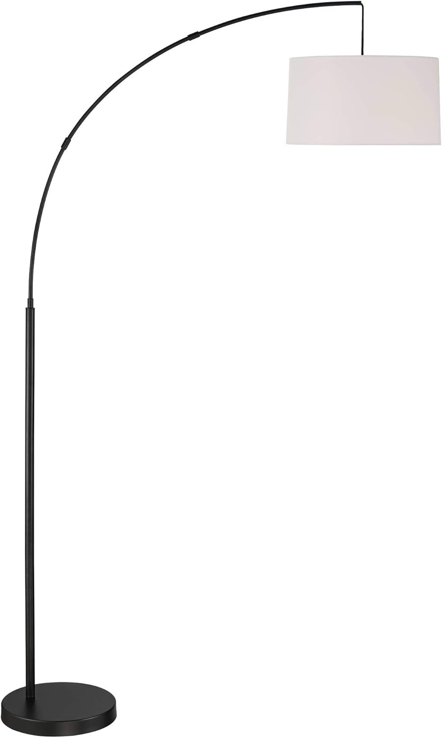 【Pre-Assembled Shades】Contemporary modern arc floor lamp from the collection by the 360 . Black finish over metal construction. White linen fabric drum shade. 8-foot long black cord.